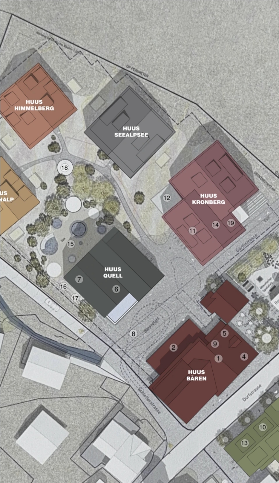 Die weitläufige Anlage besteht aus einem einzigartigen Mix aus einem 5-Sterne-Wellness-Hotel mit einem Huus Löwen (4 Sterne) und einem Huus Bären (3 Sterne), Restaurants gehobener Küche und Appenzeller Spezialitätenrestaurants, Eigentums-, Ferienwohnungen und Wohnen mit Service und bietet eine reichhaltige Mischung für vielfältige Bedürfnisse. Im Untergeschoss entsteht der wahrscheinlich grösste Weinkeller der Schweiz mit angeschlossener Showküche. Bewohner können hier in sehr privatem Umfeld, Gäste für besondere Anlässe einladen und imposante Abende verbringen. Bei der Bauweise wird besonderer Wert auf Nachhaltigkeit und traditionelles Handwerk gelegt. Dank modernen Solarpanels auf allen Dächern und einer Erdsonde-Heizung fallen geringe Nebenkosten an.